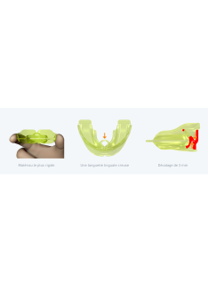• Les orifices pour le passage de l'air sont absents car le patient doit respirer par le nez à ce stade, tandis que les outils myofonctionnels, y compris une languette évasée, sont incorporées pour permettre de finaliser et poursuivre les bonnes habitudes.